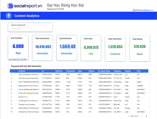 Tìm ra công thức nội dung vàng để thu hút cộng đồng: Bạn đã bao giờ tự hỏi bài đăng nào của bạn được yêu thích nhất? Chủ đề nào đang hot nhất trong cộng đồng? Báo cáo này sẽ trả lời tất cả những câu hỏi đó. Với dữ liệu chi tiết về nội dung bài đăng, chỉ số tương tác, chủ đề và từ khóa phổ biến, bạn sẽ dễ dàng xác định được những gì khách hàng của bạn quan tâm. Từ đó, bạn có thể lên kế hoạch nội dung hiệu quả, tạo ra những bài đăng hấp dẫn và lan tỏa rộng rãi trong cộng đồng